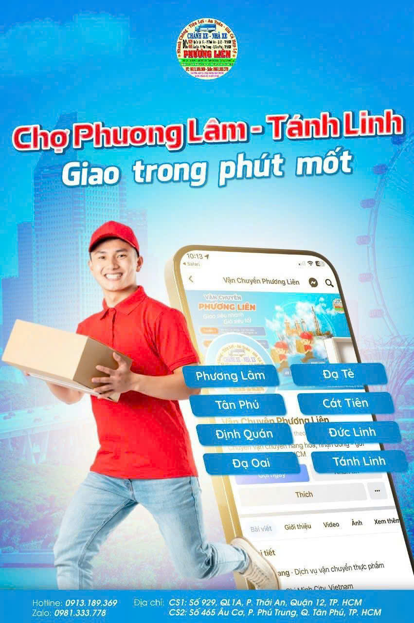 Nhà xe Phương Liên là đơn vị vận tải lâu năm, chuyên tuyến Tánh Linh – Phương Lâm ↔ TP.HCM – Đồng Nai. Với hệ thống xe tải đa tải trọng, xe chạy mỗi ngày, Phương Liên cam kết mang đến dịch vụ gửi hàng nhanh, đúng hẹn và đảm bảo nguyên vẹn hàng hóa.
